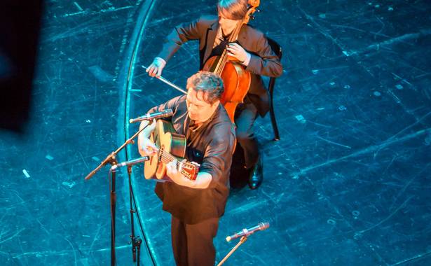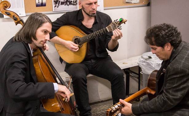Das charakteristische Instrument des Fado ist die portugiesische Gitarre (Guitarra portuguesa). Sie erinnert mit sechs Doppelsaiten an eine Mandoline und ist untrennbar mit dieser Musik verbunden. Sie gehört, übrigens wie die Gimbri der Caravane du Maghreb, zu den sogenannten Kastenhalslauten, ist ein bisschen kleiner als eine klassische Gitarre und hat 12 Stahlsaiten. Die Guitarra portuguesa ist eine Weiterentwicklung der Renaissance-Cister und der English guitar. Eine Cister, eine Zither, ist sie, weil sie gezupft wird. Sie ist ungefähr im 18. Jahrhundert entstanden und war hauptsächlich in Lissabon und in Coimbra anzutreffen. So haben sich in diesen beiden Städten tatsächlich zwei Arten von Gitarren entwickelt, die sich in der Tonstimmung unterscheiden. Die Instrumente aus Coimbra sind auch ein bisschen länger. Früher zupfte man die Portugiesische Gitarre mit den Fingernägeln, heute stecken die Musiker sich Unhas, Fingerpicks, auf die Finger. Die portugiesische Gitarre im Trio Fado wird gespielt von Daniel Pircher.